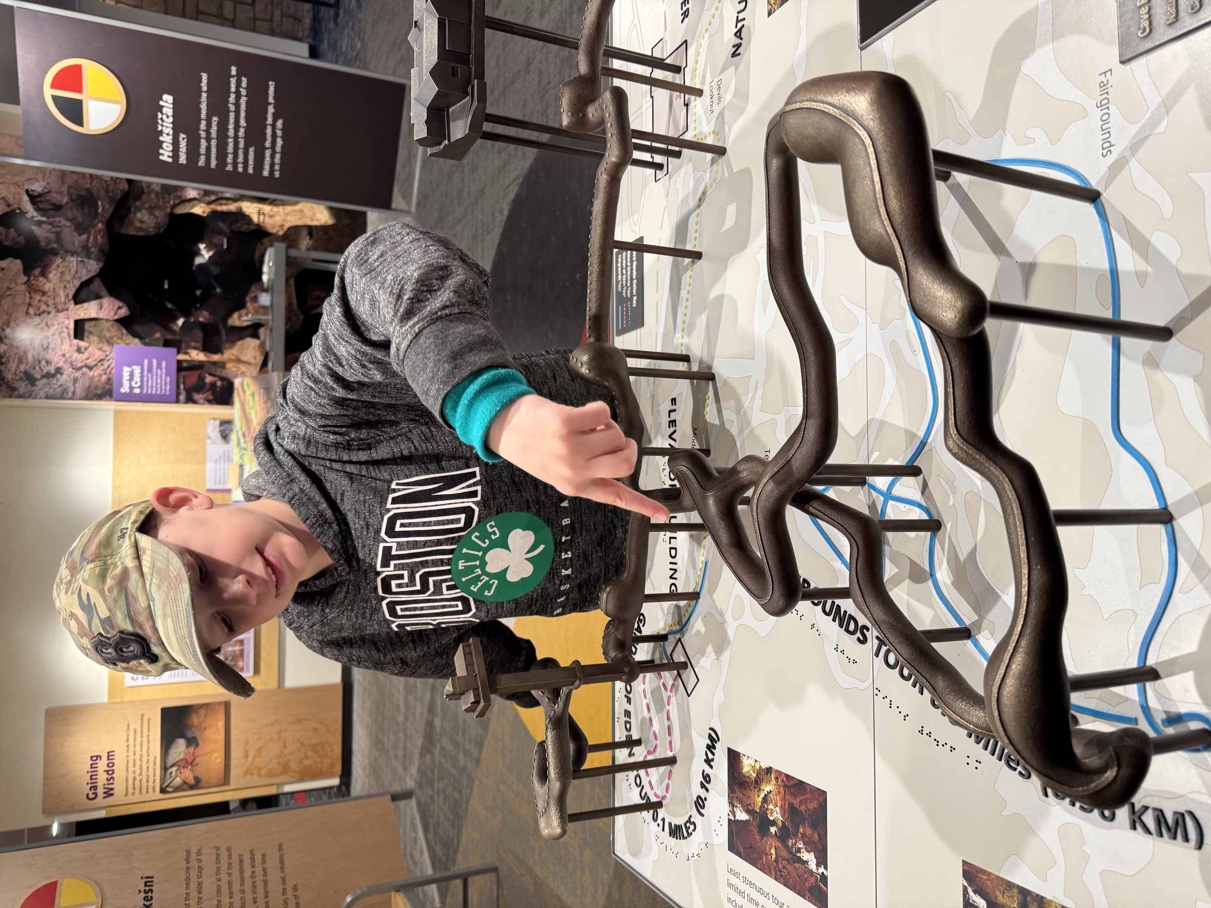 While we waited, we explored the visitor center and took a short walk on a nearby trail. I came out of the visitor center with a few facts I hadn't expected. Wind Cave is one of the longest cave systems in the world — surveyors have mapped roughly 165 miles of passages so far, and based on barometric measurements (the cave breathes, literally, with the pressure difference between inside and outside), they estimate that's only 5 to 10 percent of the cave's actual extent. The other ninety-plus percent is still down there, unmapped. And in the deep, unmapped reaches, a team of NASA-funded astrobiologists has been studying microbial life as a window into what life might look like on Jupiter's moon Europa and Saturn's moon Enceladus. The cave isn't just a cave. It's a working analog for the search for life elsewhere.
